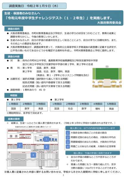 令和元年度「1・2年生チャレンジテスト」周知用リーフレットを1学期中に配付いたします。実施日時は令和2年1月9日です。テスト範囲も載っていますのでご覧ください。2年生の社会・理科ともにAの範囲です。