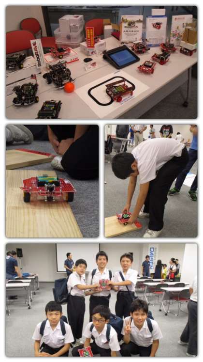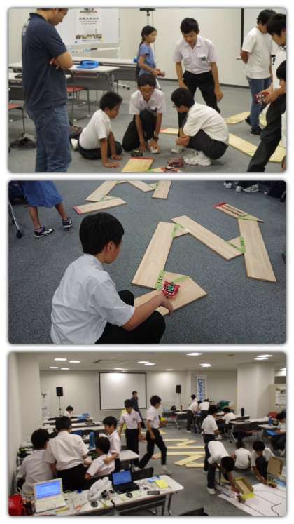 ロボットにプログラムを組み、板のコースの上を走らせ、得点を競う大会でした。苦戦しながらも仲間同士、声をかけながら走行させて大健闘!