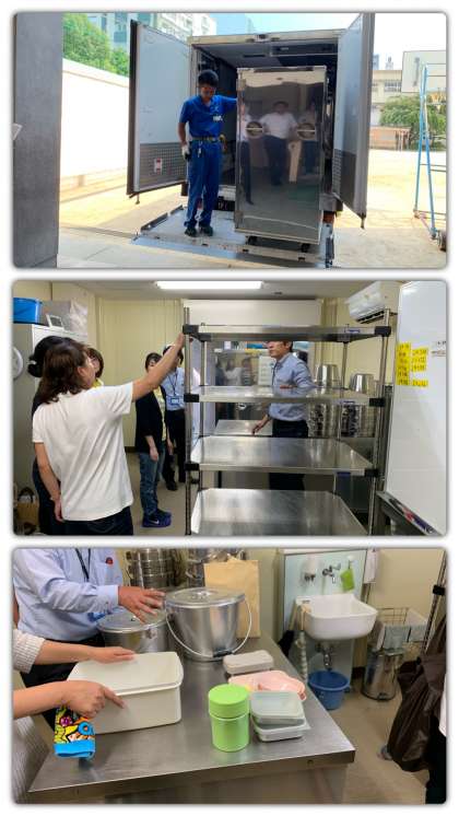 2学期から新たに実施する学校給食(自校調理方式・親子給食)に向けて、本日7月31日に試走をしました。2学期からは全員喫食になり、2つの小学校から給食が配送され、小学校と同じ方式で給食が配膳されることになります。配膳員さんも給食担当の先生たちも、配膳業者さんや教育委員会の方たちと、時間をかけて打ち合わせやシュミレーションを行いました。もうすでに担任の先生からも説明があったと思いますが、給食当番はバッチリ当番衣装三点セット(マスク・三角巾・エプロン)を決めて活躍してもらわなくてはなりません。また、生徒一人一人はランチョンマットも必要になってきます。