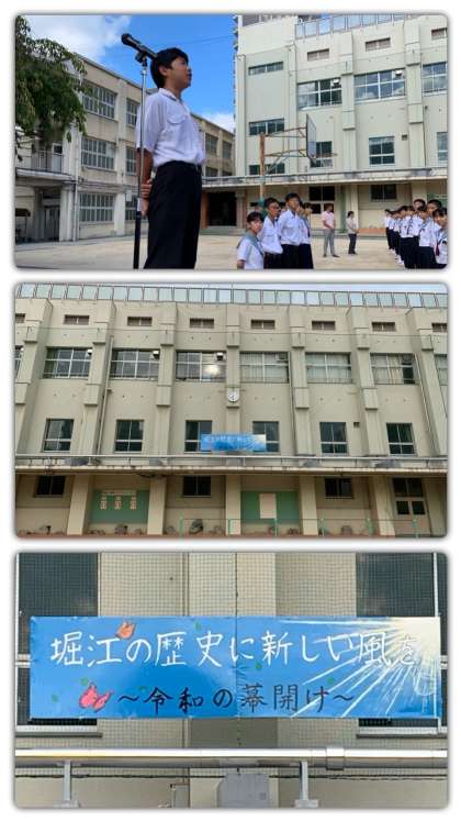 全校集会の最後に、生徒会から今年の各行事で取り組む生徒会スローガンを発表しました。すでに看板も出来上がって掲げています。「堀江の歴史に新しい風を〜令和の幕開け〜」今年はどのような新しい風を吹かせてくれるのかとても楽しみにしています。一致団結して一つ一つの行事を乗り切っていこう!