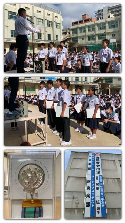 全校集会にて各種大会やコンクール等の表彰式を行っています。9月9日(月)も何人もの個人や団体に表彰状を手渡し、その頑張りを称えました。水泳部の主な活躍を下記の通り紹介します。みんなよく頑張っています!