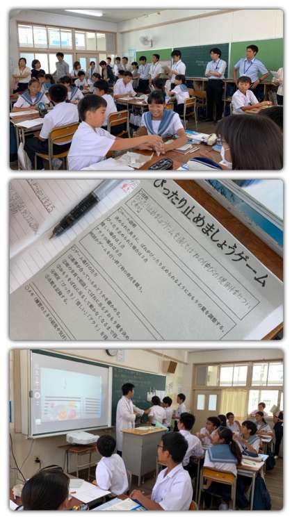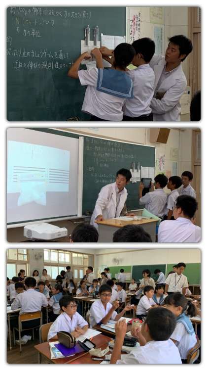 9月10日は理科の新任教員研修会も行われました。1年5組の生徒を対象に、門口先生が重さについての授業を行いました。大阪市の理科の新任の先生と堀江小学校からも6名の先生方や堀江中学校の先生も参加し、多くの参観者の中での授業となりました。