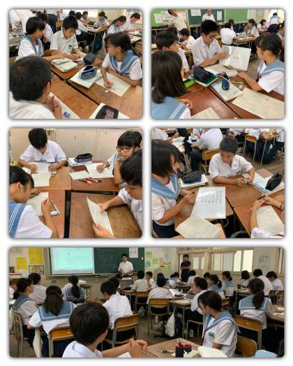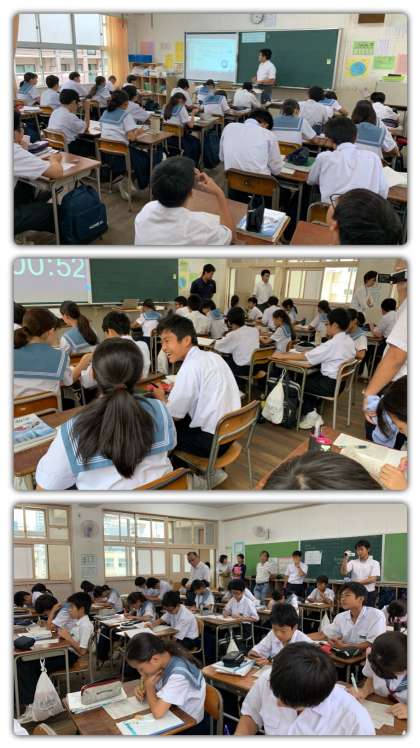 9月20日(金) 竹内先生による数学の研究授業が1-5で行われました。授業の単元は「1次方程式の利用」で、竹内先生が主に取り組まれている共同学習を中心に、授業が進んでいました。各グループでは小さなホワイトボードに解き方を説明する生徒がいたり、分からないところを聴いたりして、教える方も教えられる方も教え合いの中で理解が深まっていました。先生も生徒も生き生きと楽しそうに学習していたのが印象的でした。また、座席もグループで学習しやすいように、特別に数学座席が作られて、ペア学習・グループ学習ができるようになっていたのには工夫が感じられました。