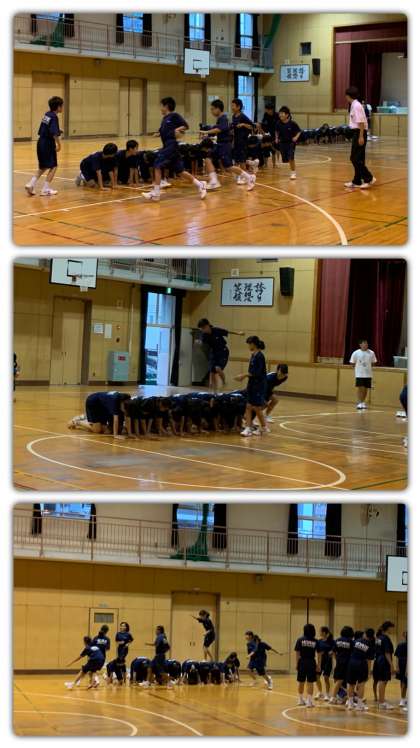 体育の授業で1年学年種目「背中渡しリレー」の練習をしています。6時間目の1年3・4組の様子です。みんなで考えコツをつかみながら、いかに早く前進することができるか、本番に向けてまた練習です。