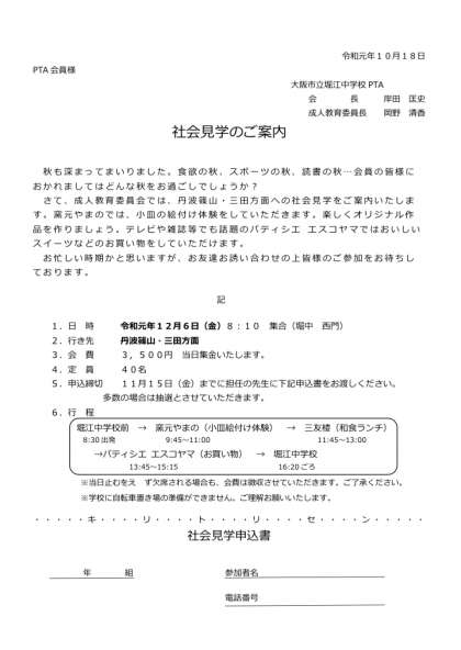 本日10月18日付でご案内を配付しました。12月例年、充実した体験活動と見学が実施され好評です。今年も多くの保護者の皆さまのご参加をお待ちしています。