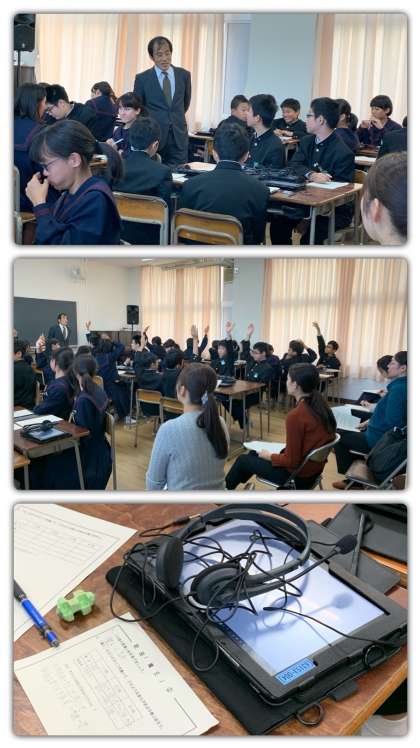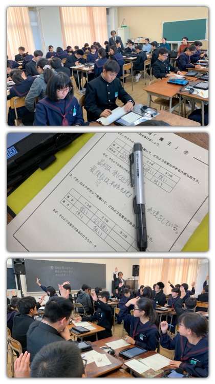 11月8日(金)6限目、1年5組の生徒を対象に、谷本先生による音楽科研究授業が行われました。教材は1年鑑賞曲の「魔王」で、近隣の中学校の音楽の先生も来られての参観になりました。