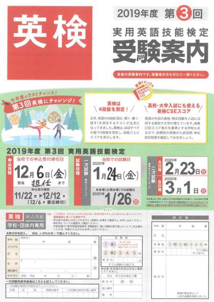 ★英検実施日時 令和2年1月24日(金)放課後3時〜