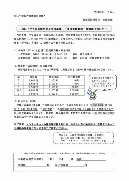 西区では、受験を希望する中学生を対象に、英語力向上を目的として、英検受験料の一部補助が行われています。堀江中学校を準会場として、下記の日程で実施します。是非この機会にチャレンジしてみよう!