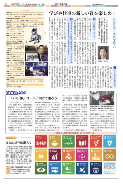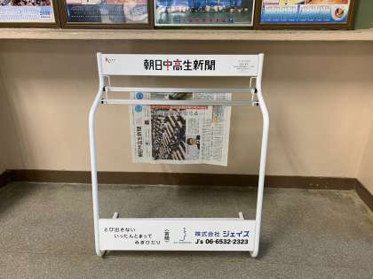 株式会社ジェイズの社長さんから、堀江中学校に11月から1年間、朝日中高生新聞を届けてくださることとなりました。毎週日曜日に発行されます。すでに2回届いていて、校長室前のスペースの壁側にラックを置いて、新聞をはさんでいます。気軽に手に取って読んでみましょう。