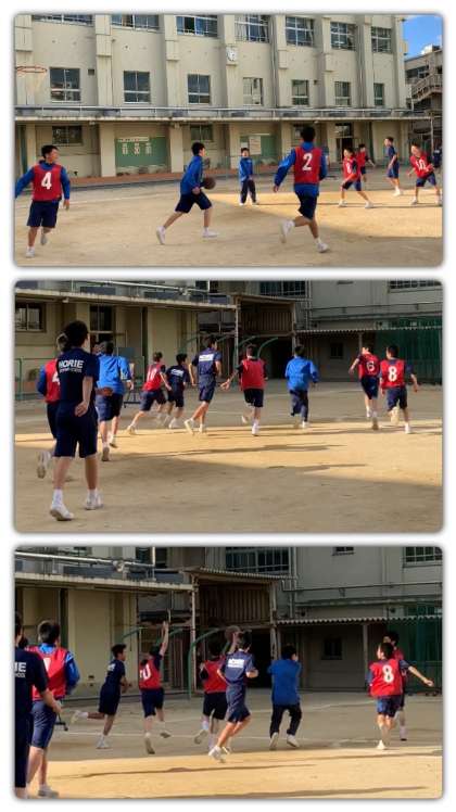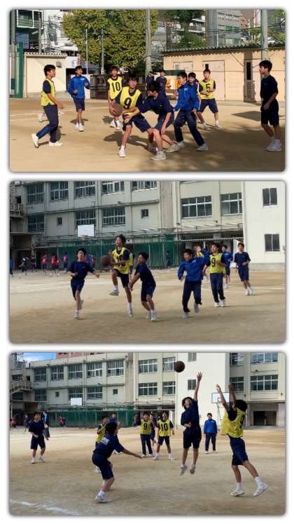 11月14日(金)6限目、1年3・4組男子の体育の授業を見学しました。種目はバスケットボール。基礎的な動きを練習した後、それらを試合形式の活動に生かして楽しく活動していました。ゴールにシュートが入るととても嬉しそうです。何回かリーグ戦で進めていくようです。それぞれのチーム名に笑いました。