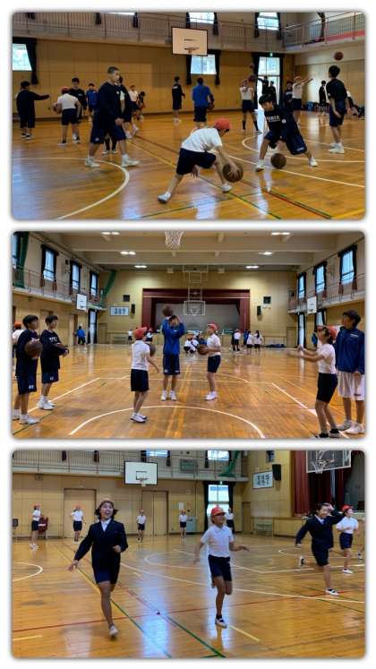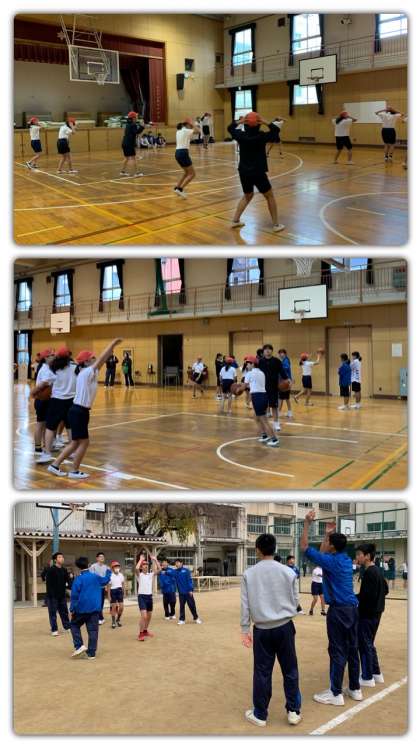 体育館ではバスケットボール部、運動場ではバレーボール部が活動しています。