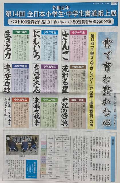 日本書芸院、読売新聞社主催の「第14回全異本小学生・中学生書道紙上展」の審査が行われました。全国から集まった15,402点の中から各学年のベスト100が決定し、その中に堀江中学校の2名の生徒が選ばれました。とても名誉なことです。おめでとうございます。
