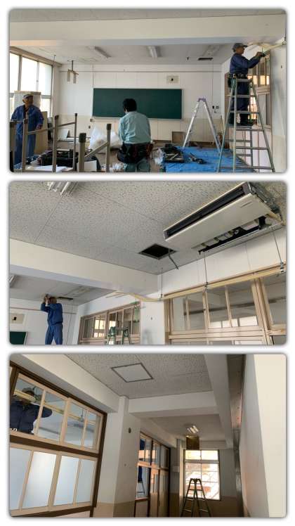 次年度の学級増に伴い、北館3階の西側の教室を普通教室として使用できるように改修工事を行っています。空調設備の設置、スピーカーの設置、扇風機の設置等、皆さんが普段過ごしている教室と同じ仕様になるよう教育環境を整備しています。堀江中学校は令和4年に移転するまでの間、このような工事が次々に行われていきます。