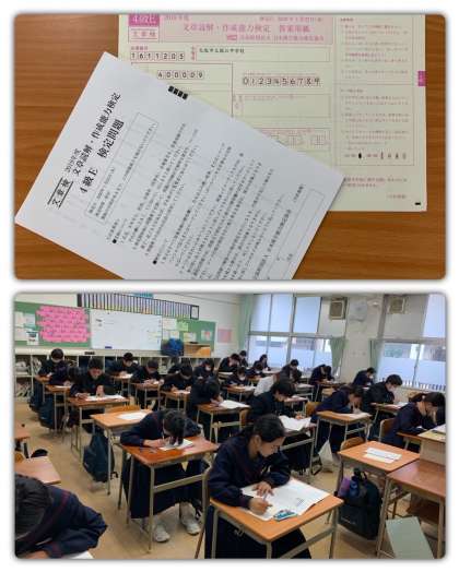 1月22日(水)6限目、2年生は大阪市で初めて「文章検」の4級にチャレンジしました。係り結びの法則、慣用句なども含め、日本語の独特の言い回し等が身に付いているか、また、文章だけでなく表やグラフ等からいかに読み取ることができるかなど、基本的な内容が試されていました。