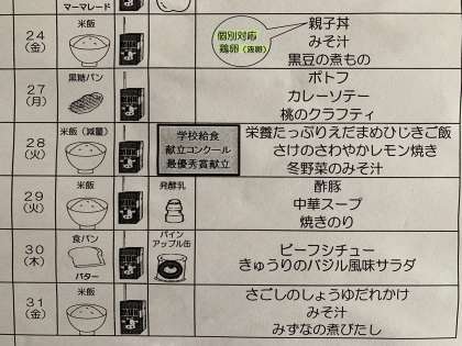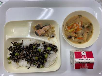 1月28日(火)の給食は、献立コンクールにて最優秀賞に輝いたメニューでした。献立は小学生が考案したものだそうです。「栄養たっぷりえだまめひじきご飯」「さけのさわやかレモン焼き」「冬野菜のみそ汁」と牛乳でした。栄養のバランスがよく、野菜もたっぷりミネラルもたっぷり取れて、とても美味しくいただきました。