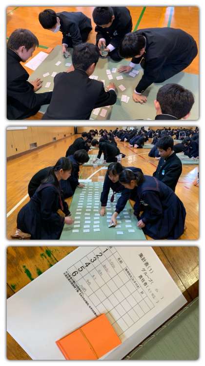 昼休みに委員長と文化委員が畳を上から降ろしたり、かるたを運んだりして準備をしました。先生のお話や代表生徒による競技上の注意の後、かるたが並べられ準備が整いました。