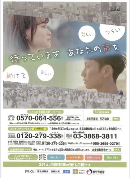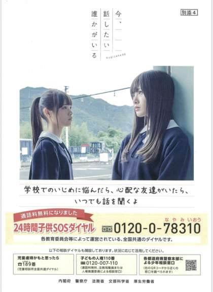 保護者や先生にも話せない場合、困ったときや誰かに相談したいときのための相談ダイヤルがあります。一人では決して悩まないでください。