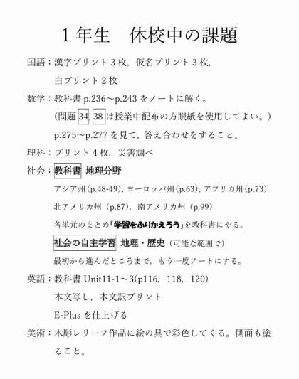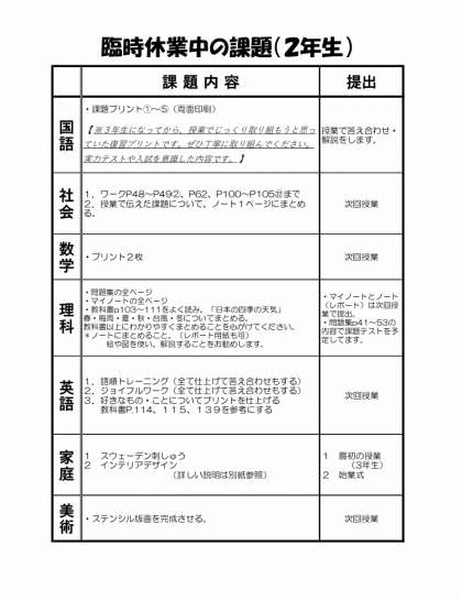13日までの臨時休業中の課題をお知らせします。2年生は既に学年だよりでお伝えしましたが、1年生もまとめましたので、一緒に掲載させていただきます。休業中の家庭学習の課題として完成させておいてください。