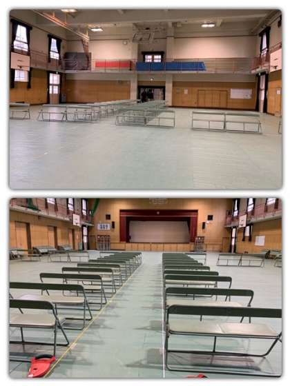生徒のいない学校は本当にさびしいです。今日の会場準備は、基準になる保護者用座席を並べるところまで進みました。少しづつバージョンアップします。