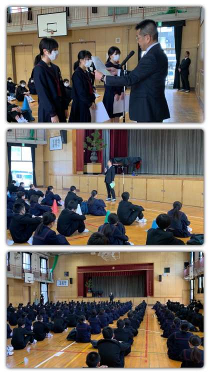 三好先生からは、この1年間を振り返り、1・2年生ともに落ち着いた状態で学習をはじめ行事等、様々な活動に取り組めた1年間でした。常に生徒の皆さんに注意していたことは「時間を守る」ということ。集会の遅刻者も年々減少したことが成果でした。一方、いじめアンケートをする中で、不安な気持ちや嫌な気持ちになったという人が、まだまだいるということが残念です。上級生になるにつれて少なくなるのは、心の成長を遂げるからだと言われています。