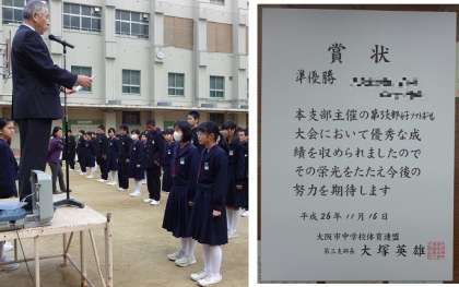 集会では、ソフトボール部の3ブロック大会準優勝の賞状の伝達も行いました。