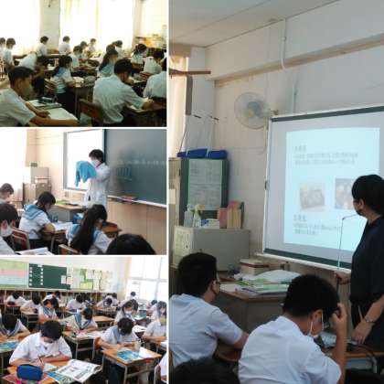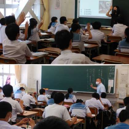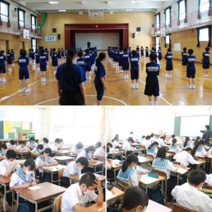 1年生の英語の授業では、書き取り小テスト、2年生の理科では、「小腸の柔突起」、2年生の家庭科では、「青魚や白魚」など、3年生の英語の授業では、「How long ?」を使い、先生がクイズ形式で授業のスタートをむかえていました。