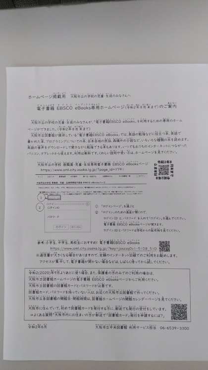 大阪市立図書館からの「大阪市立の学校 教職員・児童・生徒のみなさんへ 電子書籍EBSCO eBooks専用ホームページ(令和2年8月末まで)のご案内」をご参照いただき、自宅学習等にご活用ください。