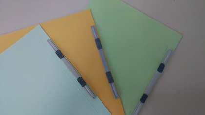 5月の登校日で1年生は緑色、2年生は黄色、3年生は青色の紙ファイルを配布して活用し、現在教室で保管しています。