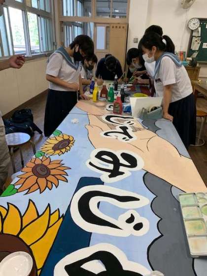 現在、生徒会を中心に美術部のみなさんと協力して、いじめ防止の啓発スローガンを横断幕に作成中です。