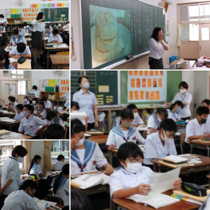 1年生では、「ワクワク」「めきめき」「キラキラ」といった「オノマトペ」という語彙を扱う単元を学習し、オノマトペを使って、「食レポをしよう!!」ということで、先生が生徒のみなさんに「デモンストレーション」を見せ、生徒のみなさんは、「食レポ」の準備を行いました。(写真は1年6組)