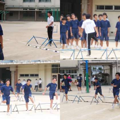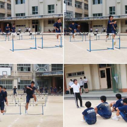 単元は「ハードル走」で、準備運動のストレッチからハードルを跳んでいる体の形を意識しながら筋肉をのばし、ジョギング片足ハードリング、ミニハードル走そしてハードリングと段階を上げて跳ぶ練習を行っていました。ハードルの跳ぶ姿勢が非常に大事だそうです!