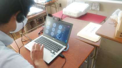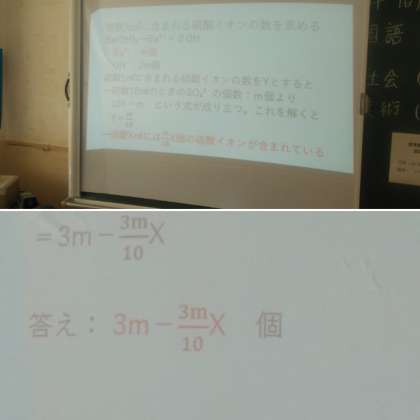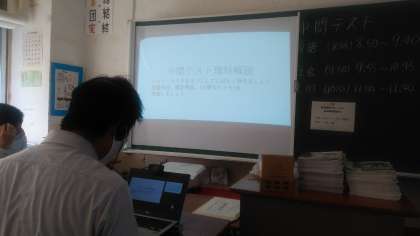 午後からは、3年生で「オンライン授業」を試みてみました。中間テストの理科のやや難しい問題を先生が、パワーポイントの内容(画面)をオンラインにのせてみなさんに解説しました。