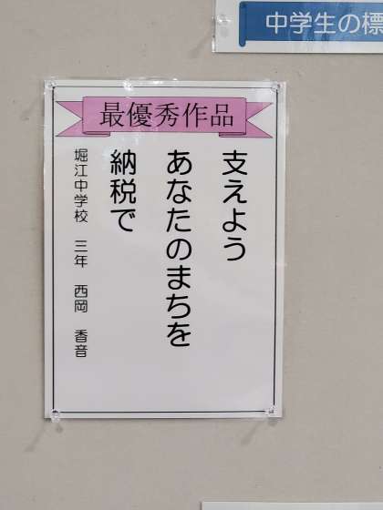 社会科の先生を通じて、西区の納税協会に応募させていただいたところ、本校生徒の標語が「最優秀作品」として選ばれました。おめでとうございます!
