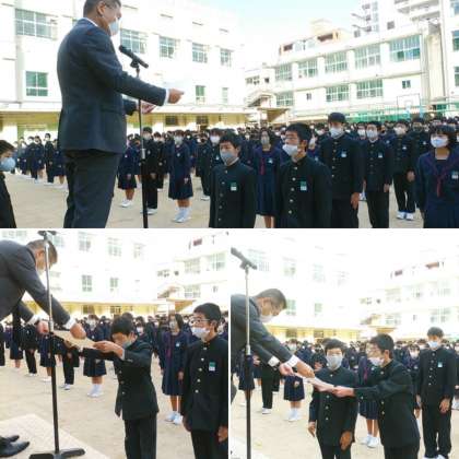 その後、科学技術部の2人組が、大阪市中学校教育研究会主催「創造アイディアロボットコンテスト(通称ロボコン)」の自律制御部門で優勝し、その賞状伝達を行いました。