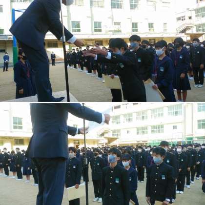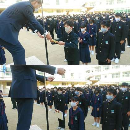 校長先生からのご講話のあとに、賞状の伝達を行い、フィギュアスケートの大会で活躍した生徒と国語科で取り組んで応募した「国連中学生作文コンテスト」で「特選・準特選・佳作」を受けた3名の2年生を堀中生みんなで称えました。おめでとうございます!