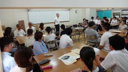 7月31日に堀江小、日吉小、堀江中の教職員が集まって、小中の連携を進めるための会議をしました。