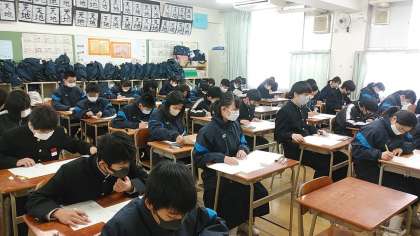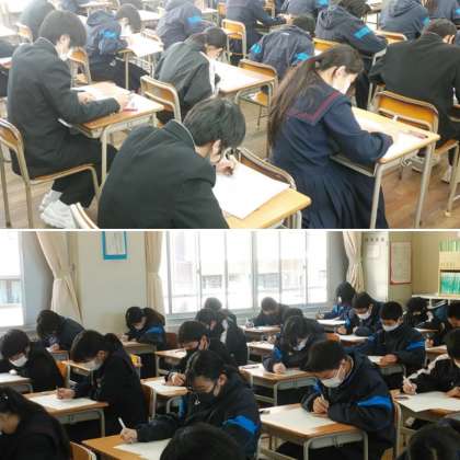 1,2年生では、昨日に引き続き「学年末テスト」が行われています。今日は、数学・技家・保体の3教科の問題に、がんばって解答しています!