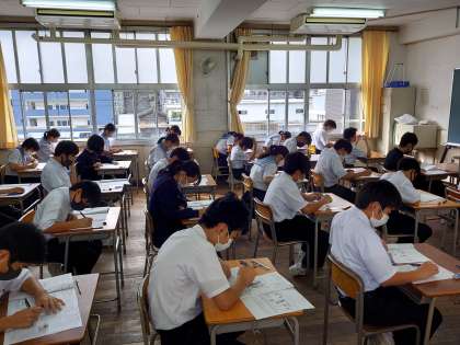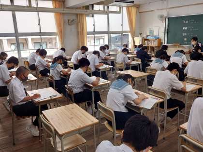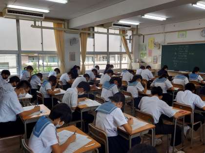 写真は1年6組、2年5組、3年6組です。集中して解答しています。