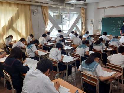 写真は、1年1組、2年1組、3年2組でのテストの様子です。