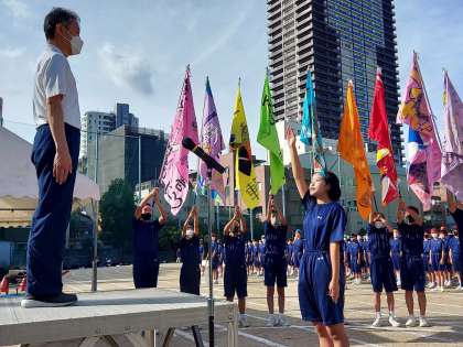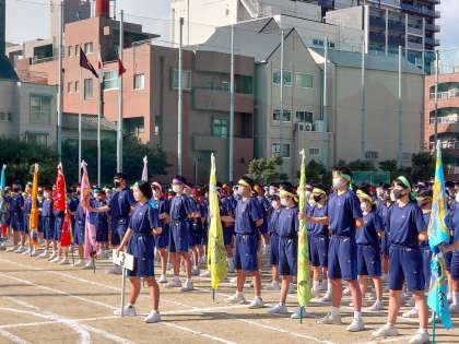 体育委員長の指示のもと、選手生徒は一斉に「おーっ!!」の声で素早く集合整列となり、開会式が始まりました。