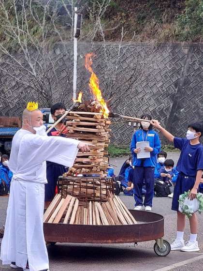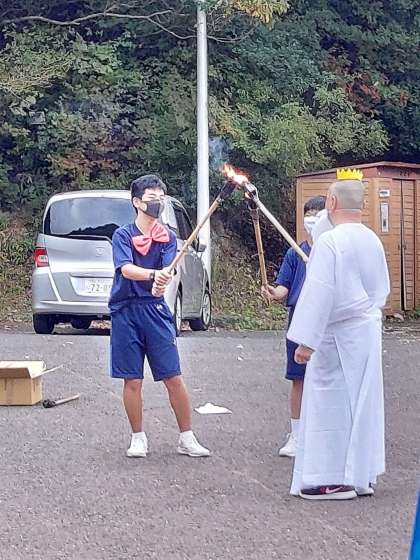 キャンプファイヤーを灯す火がないため、火の神様が登場!火を分けてもらい、点火しました。