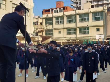 賞状伝達を行い、校長先生から美術部、卓球部男子、男子バレーボール部に賞状が授与されました。みなさん、おめでとうございます!