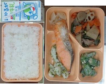 今日の給食の献立は、鮭の塩焼き、じゃがいもの磯辺風味、筑前煮、オクラのおひたし、大根の梅肉あえ、でした。