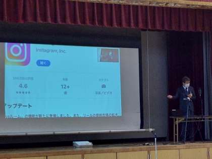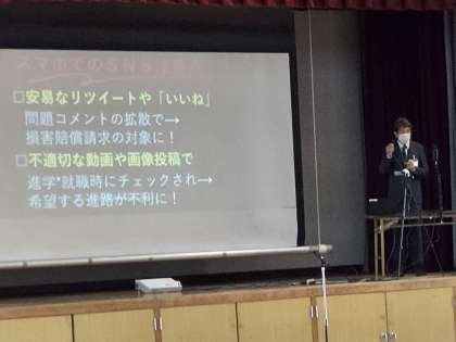 インターネットを使用することの危険ごとや生徒のみなさんがよく使っているであろうアプリの危険性やコメントや画像等を投稿することの責任とそのことによる将来に起こりうるリスクなどをお話いただきました。