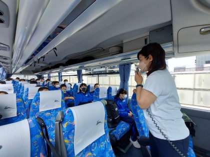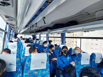 1年生を乗せたバス車内では、音楽を聞きながら、隣のお友だちと談笑して楽しい雰囲気で過ごしています。