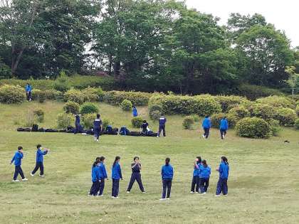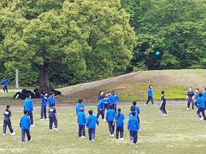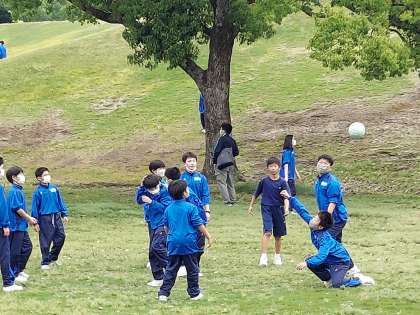 広大な広場で、クラスごとにわかれて、バレーボールやドッジボール、鬼ごっこや坂を転がるなど、お友だちとの親睦を深めています。