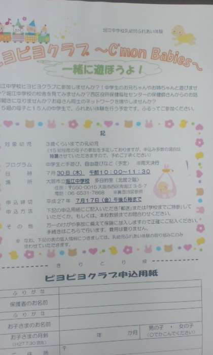 昨日の全校集会で、北村先生から地域の人たちとの会合で、「堀江中学校の生徒の大きな挨拶の声が、交わす地域の人たちへ元気を伝えてくれている」というお褒めの言葉をいただいたとお話がありました。堀江中学校のピヨピヨクラブ(乳幼児ふれあい体験学習会)に参加して、大きな声であいさつする姿をご覧になりませんか?!7月30日(木)に行いますピヨピヨクラブの申し込みは17日(金)までです。詳細は、このホームページ右側の「全校生徒」⇒「堀江中学校乳幼児ふれあい体験」をご覧ください。または、下記の「堀江中学校乳幼児ふれあい体験」をクリックしてください。堀江中学校乳幼児ふれあい体験