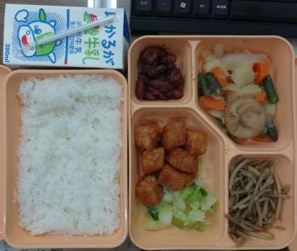 今日の献立は、鮪(マグロ)のオーロラ煮、ボイルキャベツ、一口がんもと野菜の煮もの、きんぴらごぼう、金時豆の煮もの でした。