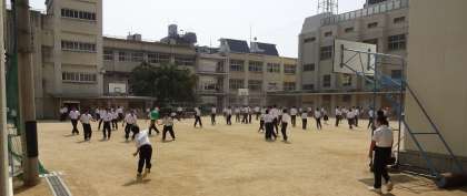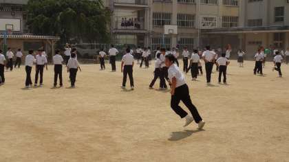 昼食を食べ終わった後のグランドは、ボール遊びの生徒の姿でいっぱいです。
