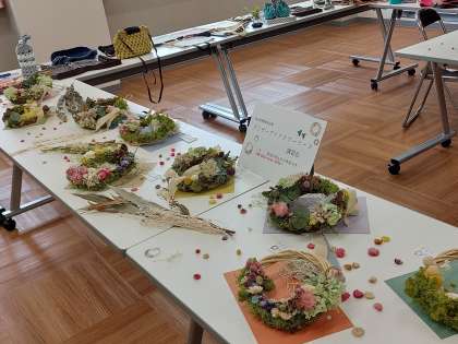 PTAからは先日の講習会で作成した「フラワーリース」やみなさんが自主作成された作品がたくさん展示されていました。どちらも力作ぞろいです。